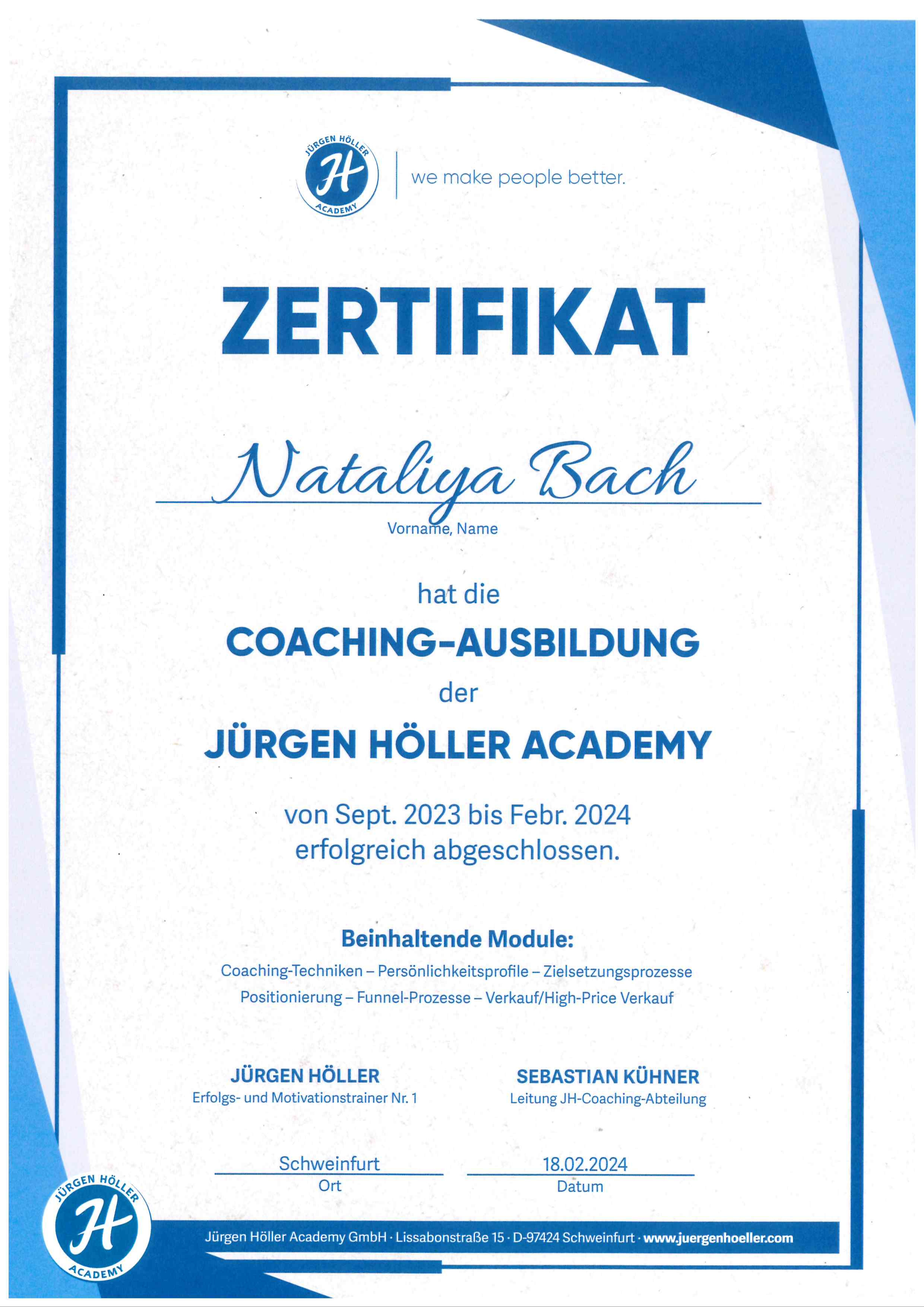 Ich habe Nataliya Bach als eine freundliche mitfühlende Coach kennen und schätzen gelernt. Sie ist einfühlsam und kompetent. Jedes Gespräch mit ihr gibt mir neue Impulse und Motivation, entweder weiter zu gehen oder etwas zu ändern, je nachdem, was gerade dran ist. Jederzeit gerne wieder bei ihr!